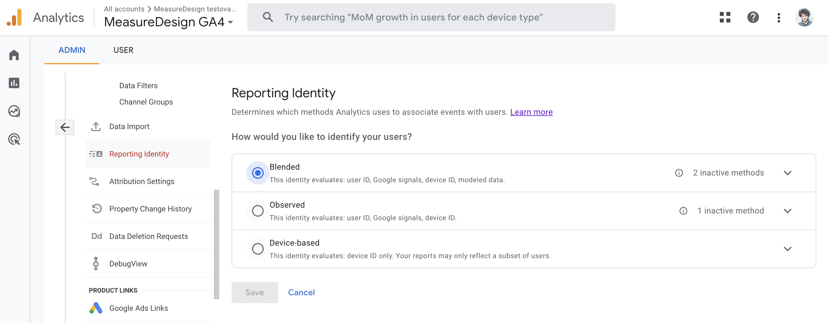 Tato funkcionalita se dá v Admin rozhranní GA4 upravit a to v Admin - Reporting Identity. Přednastavená hodnota po založení účtu je „Blended“. To znamená, že vaše GA4 bude Google Analytics domodelovávat. V případě že toto nechcete, lze vybrat v nastavení účtu volbu „Device-based“.