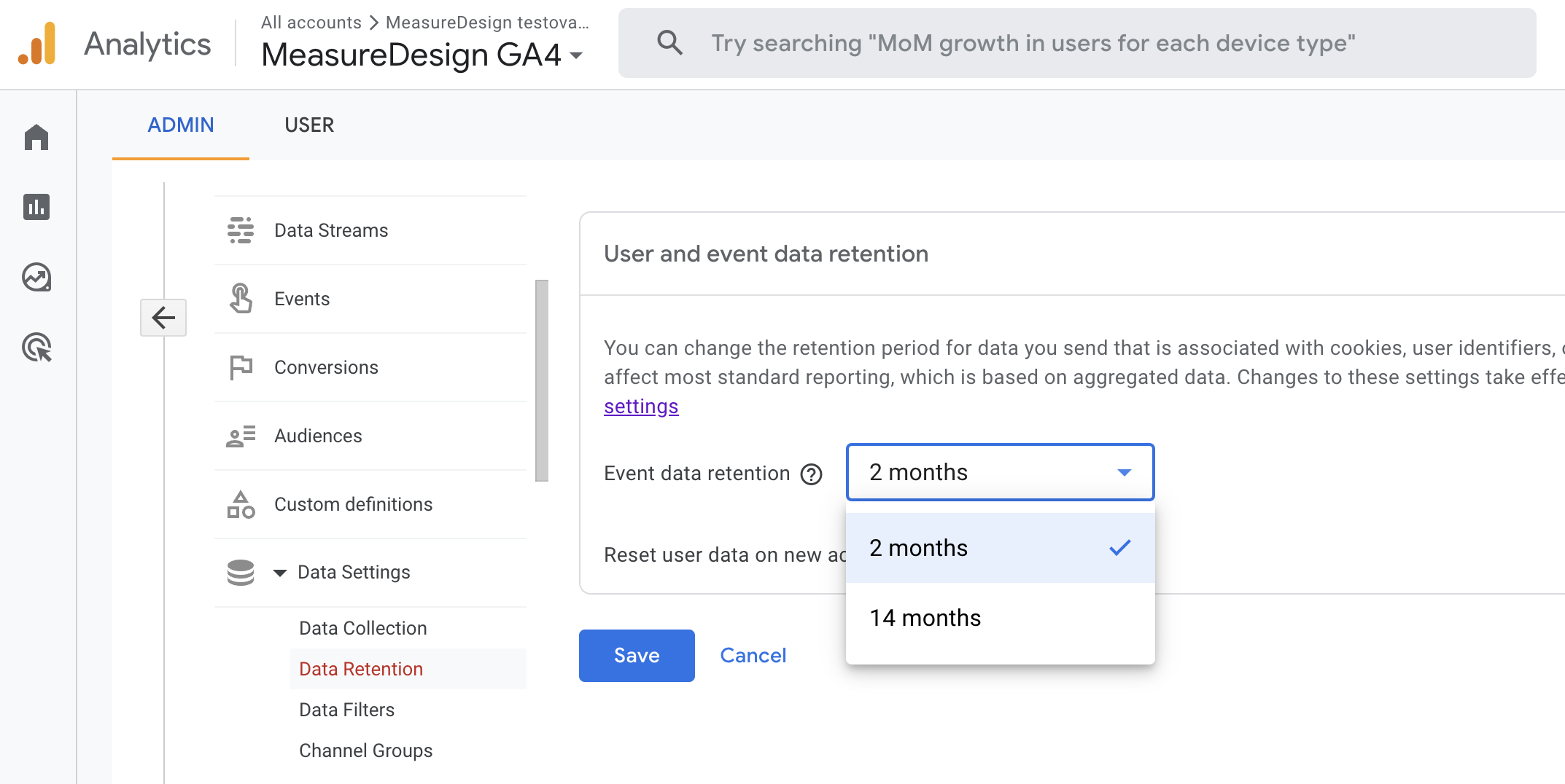 Google nabízí úpravu doby, po které budou uživateli plně přístupná všechna data v rozhraní GA4, přičemž přednastavená doba je pouhé 2 měsíce. Doporučuji upravit toto nastavení na 14 měsíců, což je maximální možná doba ve free verzi GA4. Neznamená to, že pokud tuto úpravu neprovedete, po dvou měsících budou data z GA4 účtu odmazána. Data starší než 2, resp. 14 měsíců, pouze nebudou dostupná ve všech reportech. Např. v řadě reportů v části „Explore“ GA4 rozhraní.