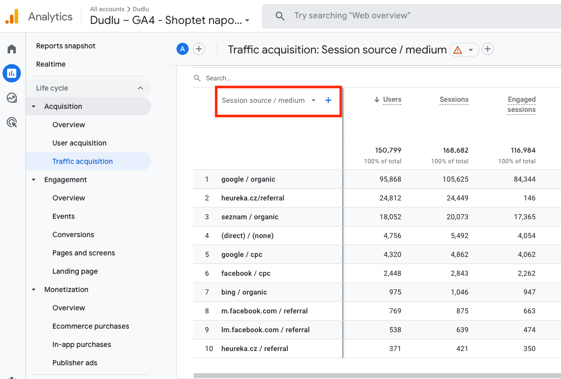 Tento report obsahuje pohled na počet uživatelů a návštěv za vybrané časové období. GA4 stejně jako GA3 umí automaticky interpretovat UTM parametry. Tento report ukazuje pohled přes defaultní channel grouping, nicméně doporučuji si ho v červeně označeném selektoru přepnout na srozumitelnější kombinaci dimenzí „Session source / medium“ (případně „Session campaign“).
