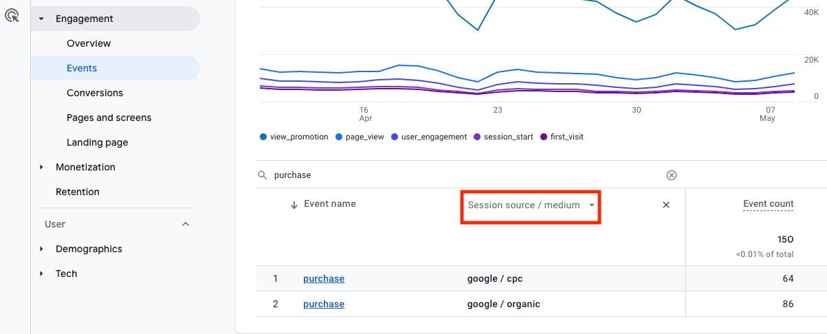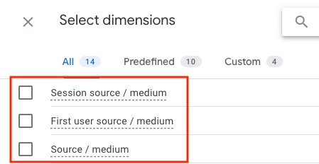 Session source/medium, Session campaign apod. – tyto dimenze ukazují výkon daného zdroje v rámci návštěvy (session). Tj. pokud chci vidět, jaké zdroje mi přinesly návštěvy, nebo zdroje návštěv, v rámci kterých se staly konkrétní eventy, použiji „Session source/medium“, „Session campaign“ apod.). Je to ekvivalent „source“, „medium“, „campaign“ apod. v rozhraní GA3.