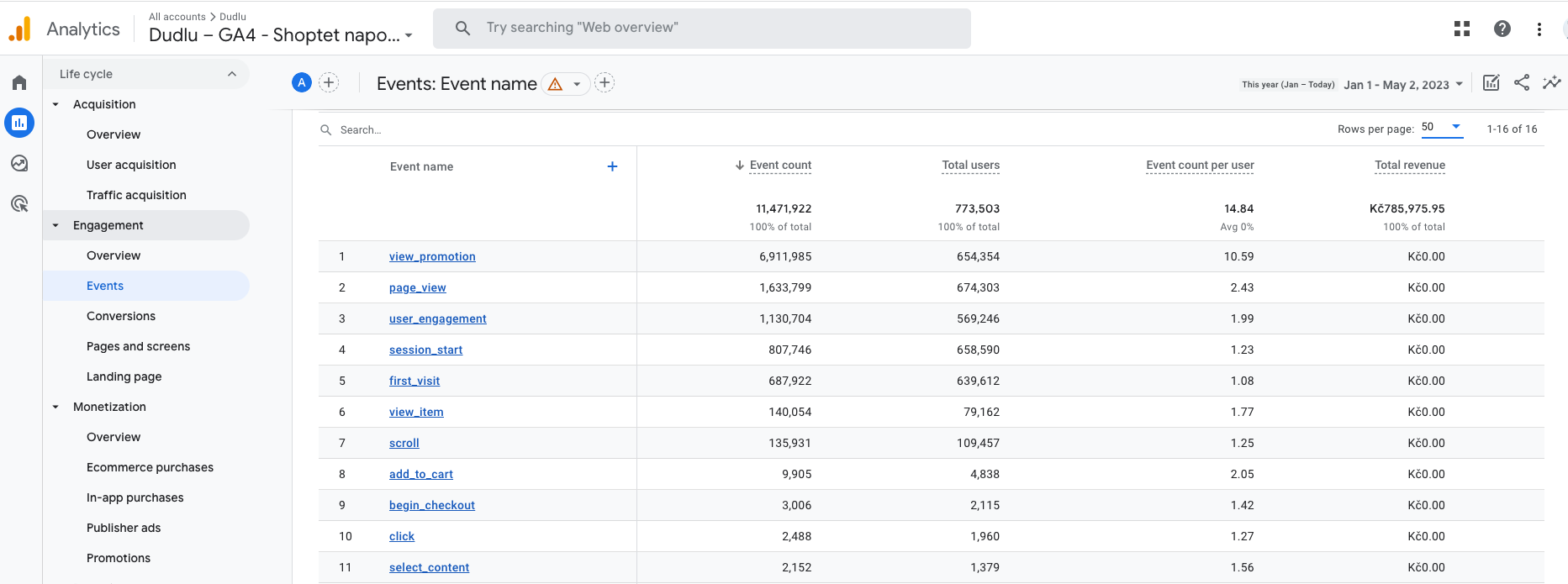 K názvům eventů – i pokud máte Google Analytics v češtině, tyto eventy budou v rozhraní v angličtině.