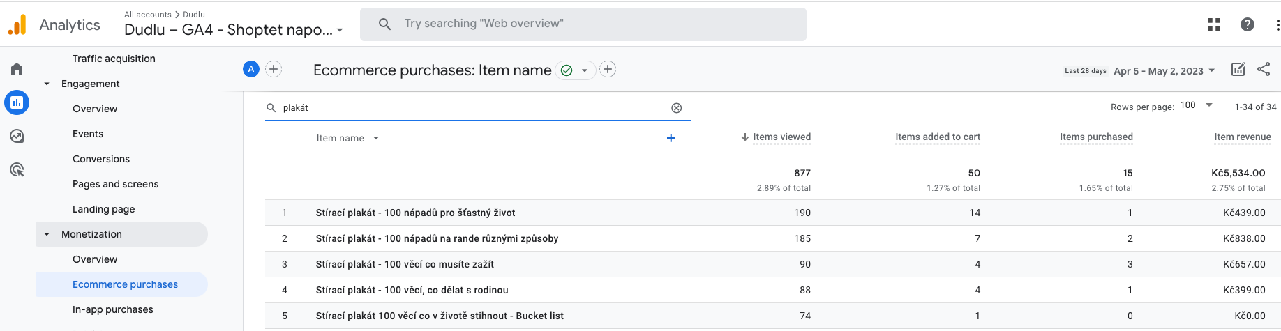 Tento report obsahuje počty jednotlivých zakoupených produktů a jejich zdroje. Zároveň ukazuje počet zobrazených produktů („items viewed“), počet produktů přidaných do košíku („items purchased“) a počet zakoupených produktů („items purchased“). Poslední sloupec je revenue z daných produktů.