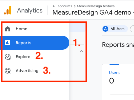 Přihlášení se do Google Analytics 4 a využití reportů v rozhraní nástroje – tato možnost nevyžaduje žádné technické znalosti. V rozhraní GA4 jsou jak předpřipravené reporty, tak možnost vytvořit si vlastní report (jejich detailní popis níže).